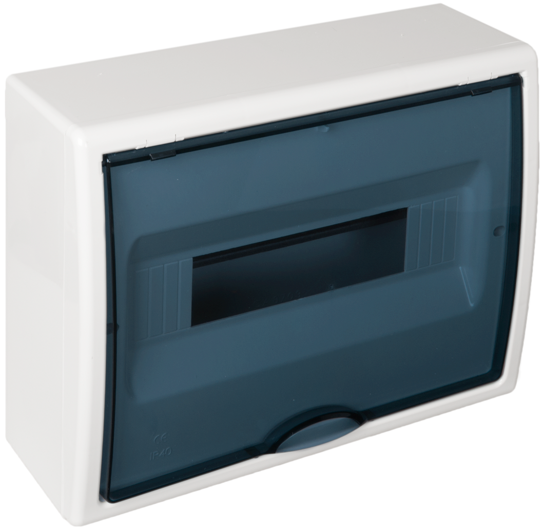 Caja de distribución de superficie para 12 circuitos. Caja blanca con puerta fumé. Dimensiones exteriores: 302 x 247 x 104 mm. Modelo práctico y funcional con diseño discreto para uso en superficies visibles.