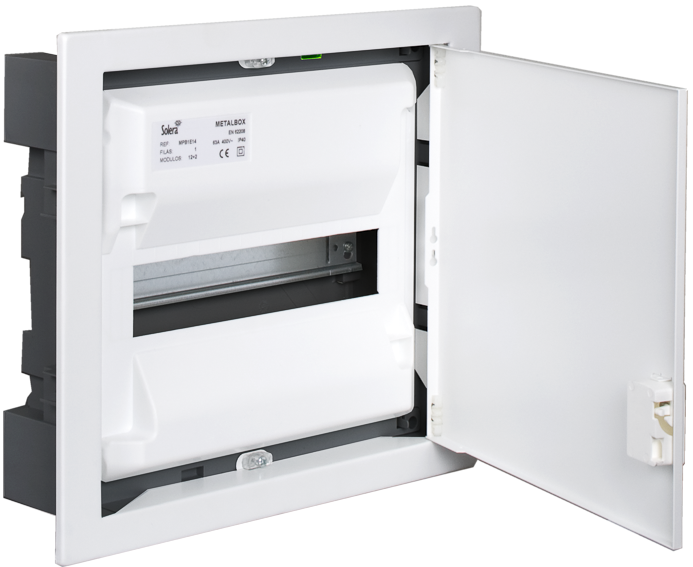 Caja de distribución de empotrar de 14 circuitos. Con marco y puerta metálicos color blanco. Caja color negro, tapa color blanco material termoplástico. Dimensiones para empotrar 333 x 300 x 88 mm. Disipación térmica de 30W.