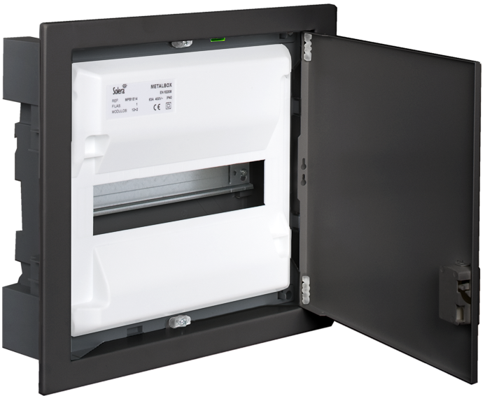 Caja de distribucion de empotrar de 14 elementos. Con marco y puerta metálicos color grafito. Caja color negro, tapa color blanco material termoplástico. Dimensiones para empotrar 333 x 300 x 88 mm. Disipación térmica de 30W.