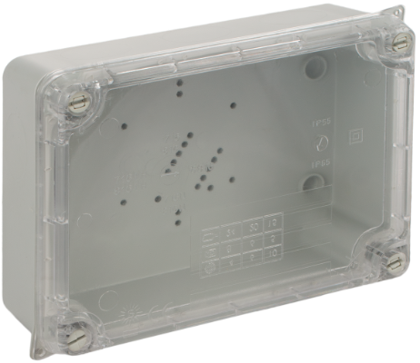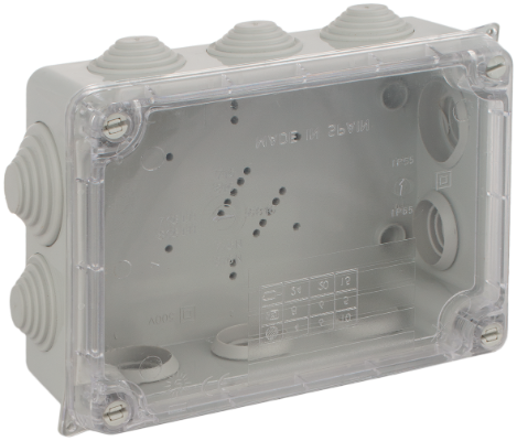 Caja estanca de conexión sin conos. Color gris y tapa transparente.IP65. IK08. Dimensiones interiores 220 x 170 x 140 mm. Cierre con tornillos 1/4 de vuelta. Precintable.